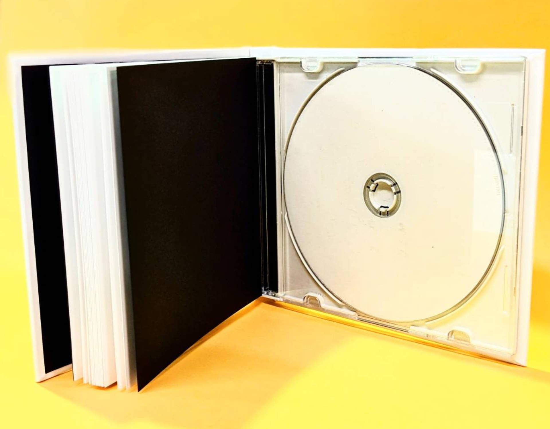 本の見返し部分に、CDやDVDを収納するための紙製やPP製のポケットを貼り付けます。写真集や作品集、